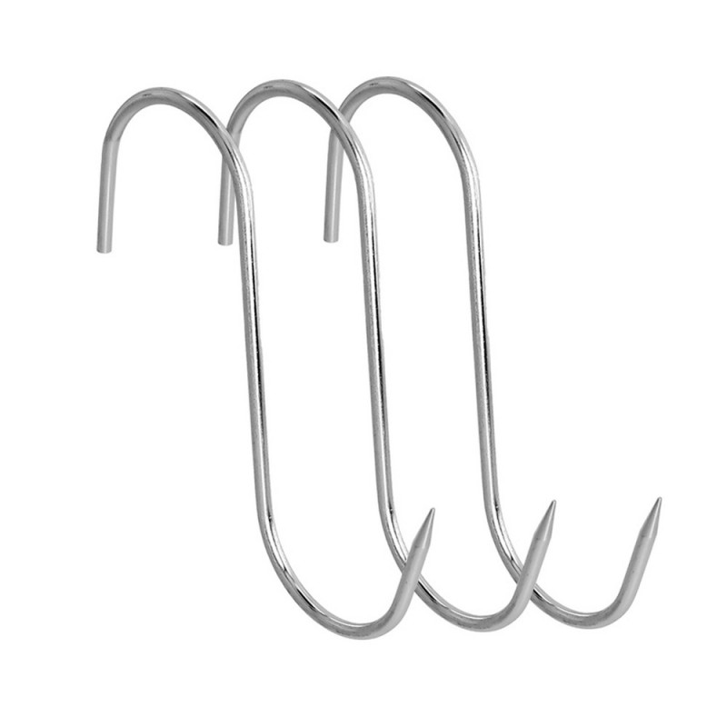 - Forma "S" con punta puntiaguda para facilitar el clavado en productos cárnicos.